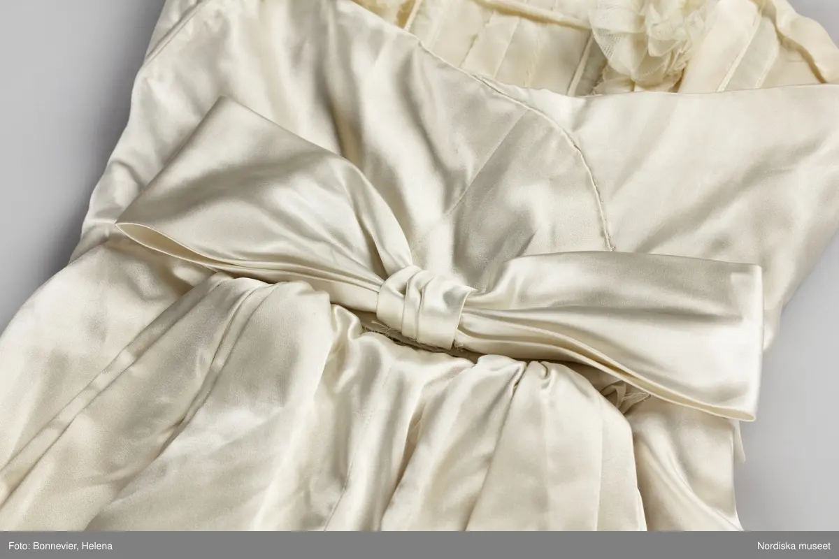 insydda i kanaler. Tyllblommor vid bysten bidrar med form och komfort. Typiskt för couturehantverket är även handkastade sömsmåner, hyskor och hakar, tygklädda knappar samt blytyngder som tynger ner fållen.