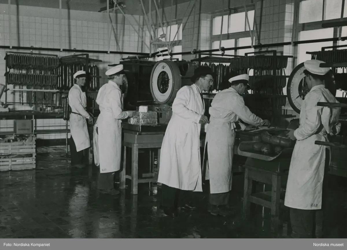 Matberedning i storkök. Fyra män med vita förkläden och vita skärmmössor vid arbetsbord. En man i vit rock och svart hatt kontrollerar. Runt väggarna hänger olika sorters korv från metallställningar. Text med blyerts på baksidan: "C.L. Enskede mars 1948.