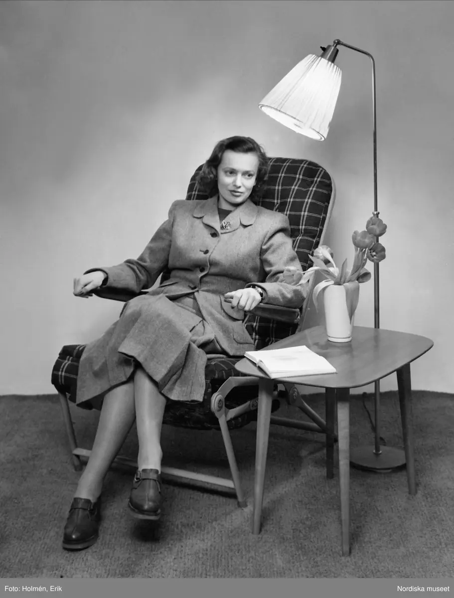 Kvinna sitter i fåtöljen "Vilosov." Nordiska Kompaniet.