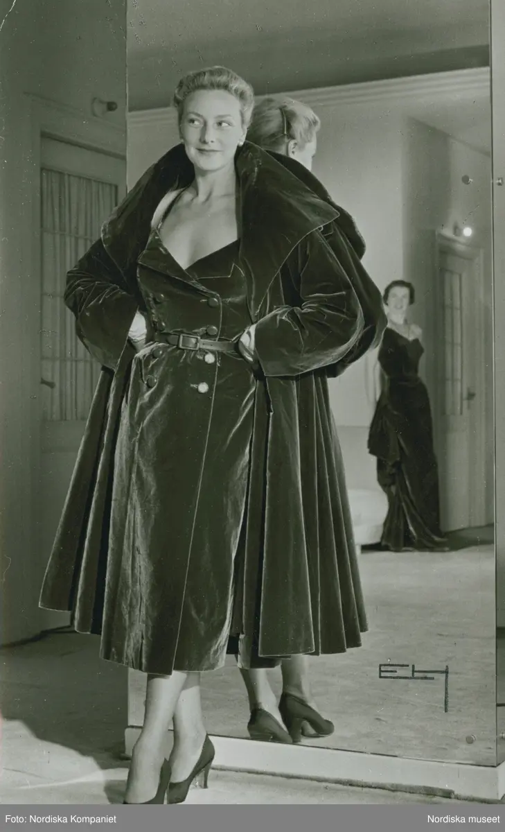 Modell i klänning och aftonkappa i sammet, från Edward Molyneux. Modell i aftonklänning i bakgrunden.