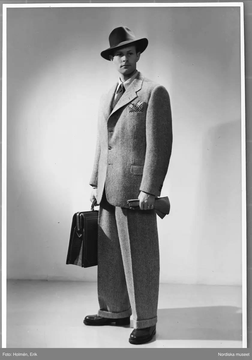 Mode från Nordiska Kompaniet. Ung man iklädd grov tweedkostym, vit skjorta och småmönstrad slips, i bröstfickan en rutig näsduk. Han bär hatt och på fötterna grova skor. I den ena handen håller han ett par skinnhandskar, i den andra en portfölj.