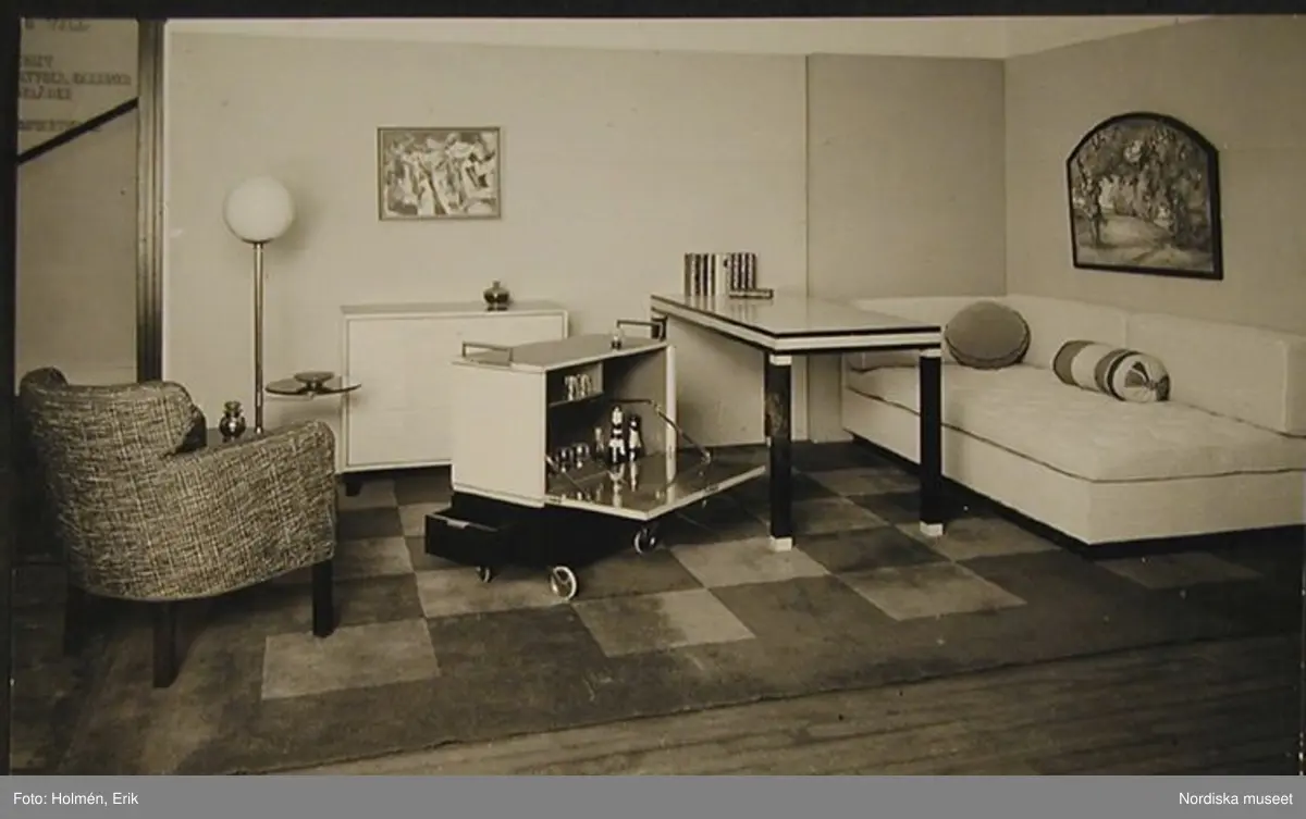 Vardagsrum, interiör. Möbelutställning på Nordiska Kompaniet, BD 1934. Ljus soffa, bord, serveringsvagn med barskåp, fåtölj, rutig matta, klotlampa, golvlampa. Modell Corall formgivet av Axel Einar Hjort.