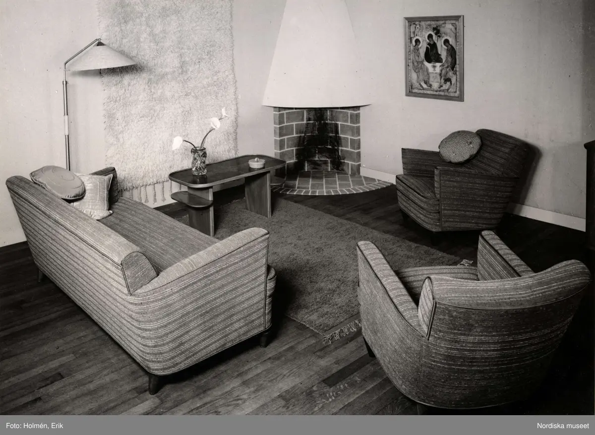 Vardagsrum. Två fåtöljer, en soffa samt en öppen spis i ena hörnet. Nordiska Kompaniet. Arkitekt A. E. Hjort, utställningen ”Vackra möbler” i maj 1937.