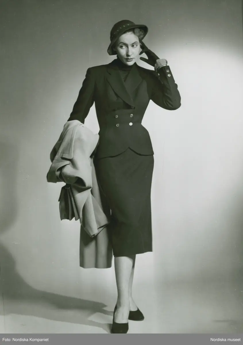 Modell i dräkt, hatt, handskar pumps, handväska och kappa i handen.