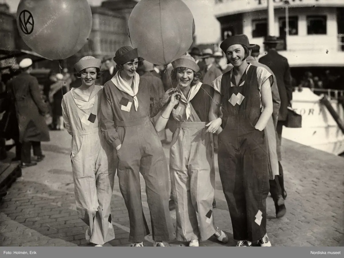 Fyra kvinnliga modeller iklädda overaller, håller i två reklamballonger. "NK (Nordiska Kompaniet) i Stockholm introducerade för några dagar sedan en ny klädsam sommarkostym för damer, "Camp-Ahla"-dräkten. De fyra mannekängerna visade dräkten ute i staden i juni 1929"