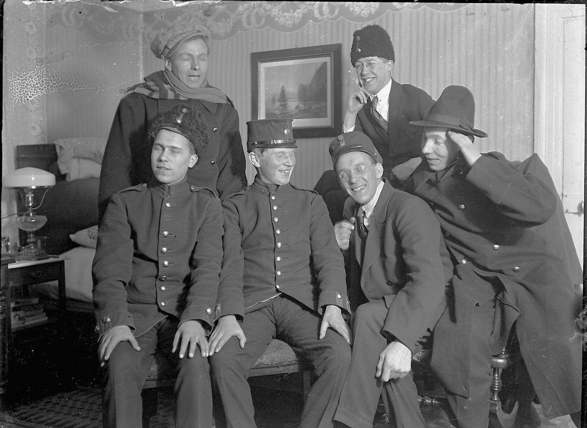 Gruppbild av unga män klädda i militärpersedlar, eventuellt maskerad. Lima, Dalarna