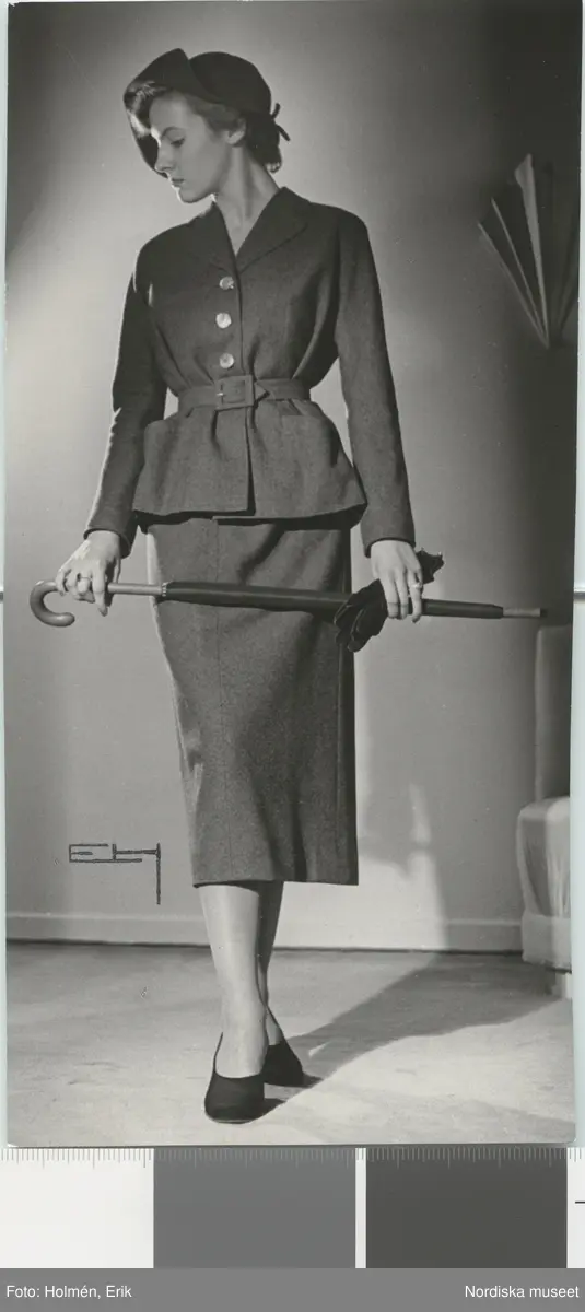 Nordiska Kompaniet. Kvinna i dräkt med med vadlång kjol. Enkelknäppt jacka med ljusa, stora knappar, Hårt åtdraget skärp. Hatt med uppvikt brätte fram, liten rosett bak. Framför sig håller hon ett paraply och i ena handen ett par mörka handskar. Text på baksidan: "N.K.s kläder"