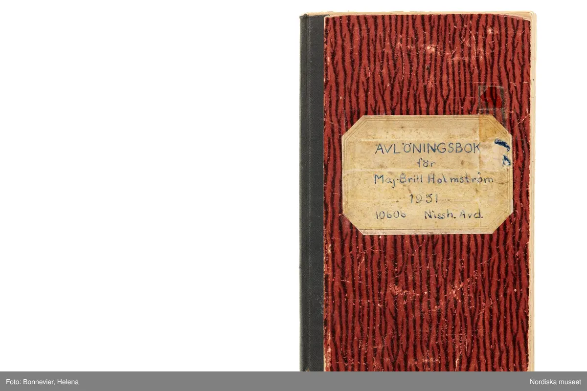 Avlöningsbok (tidbok) som sträcker sig från 1951 till 1955, har tillhört sömmerskan Maj-Britt Holmström på NK:s Franska damskrädderi.