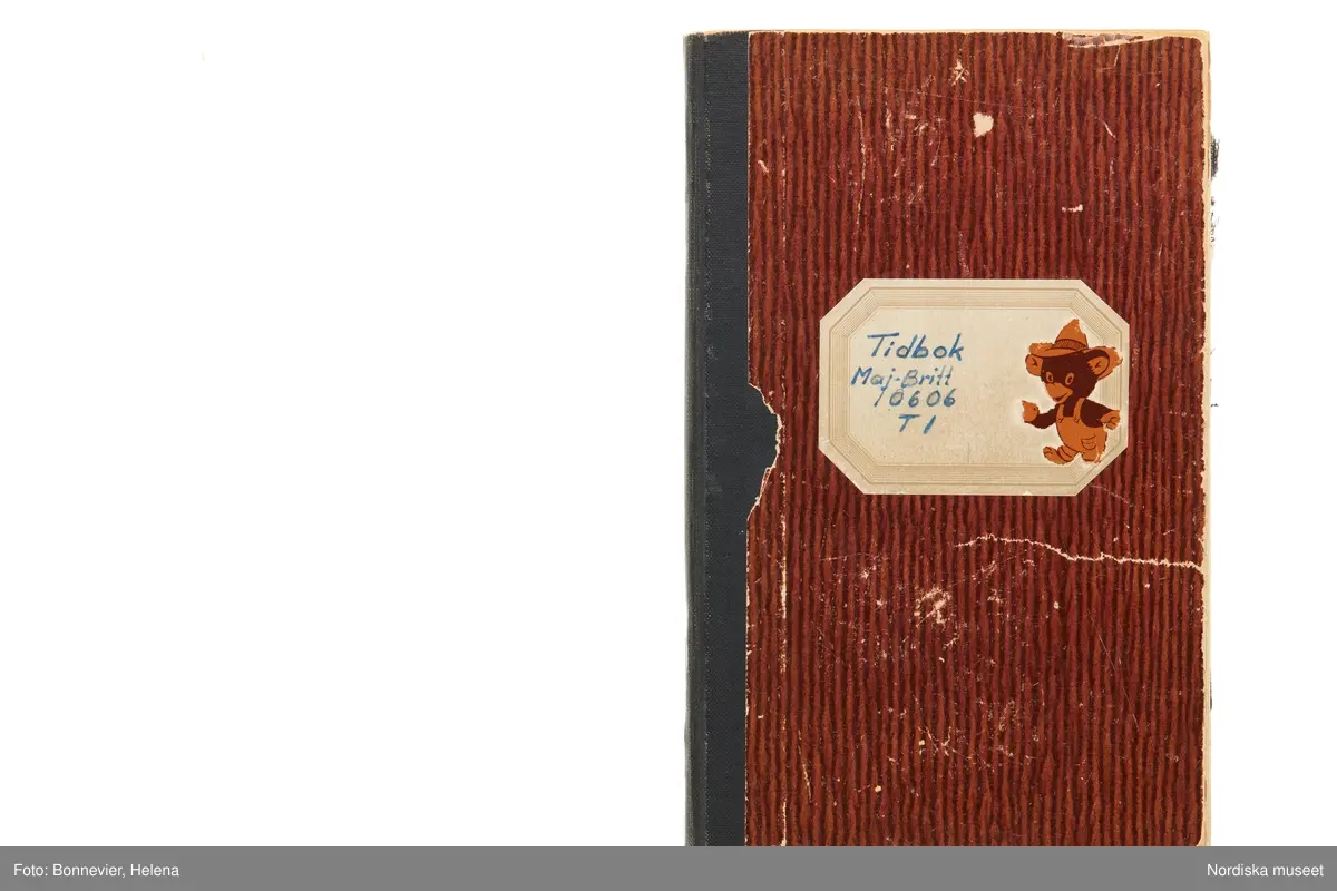 Tidbok som sträcker sig från 1954 till 1958, har tillhört sömmerskan Maj-Britt Holmström på NK:s Franska damskrädderi. Här kan utläsas kundernas namn, arbetstimmar samt materialangivelser.