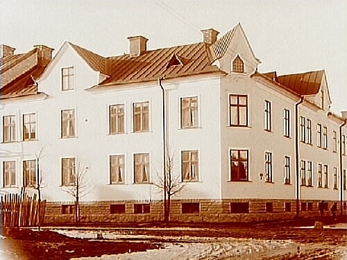 Två vånings vinkelbyggt bostadshus med tre frontespisar.