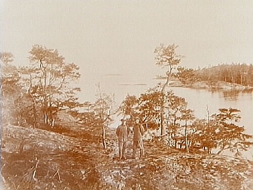 Utsikt, två män vid en sjövik, Hjälmaren (?)