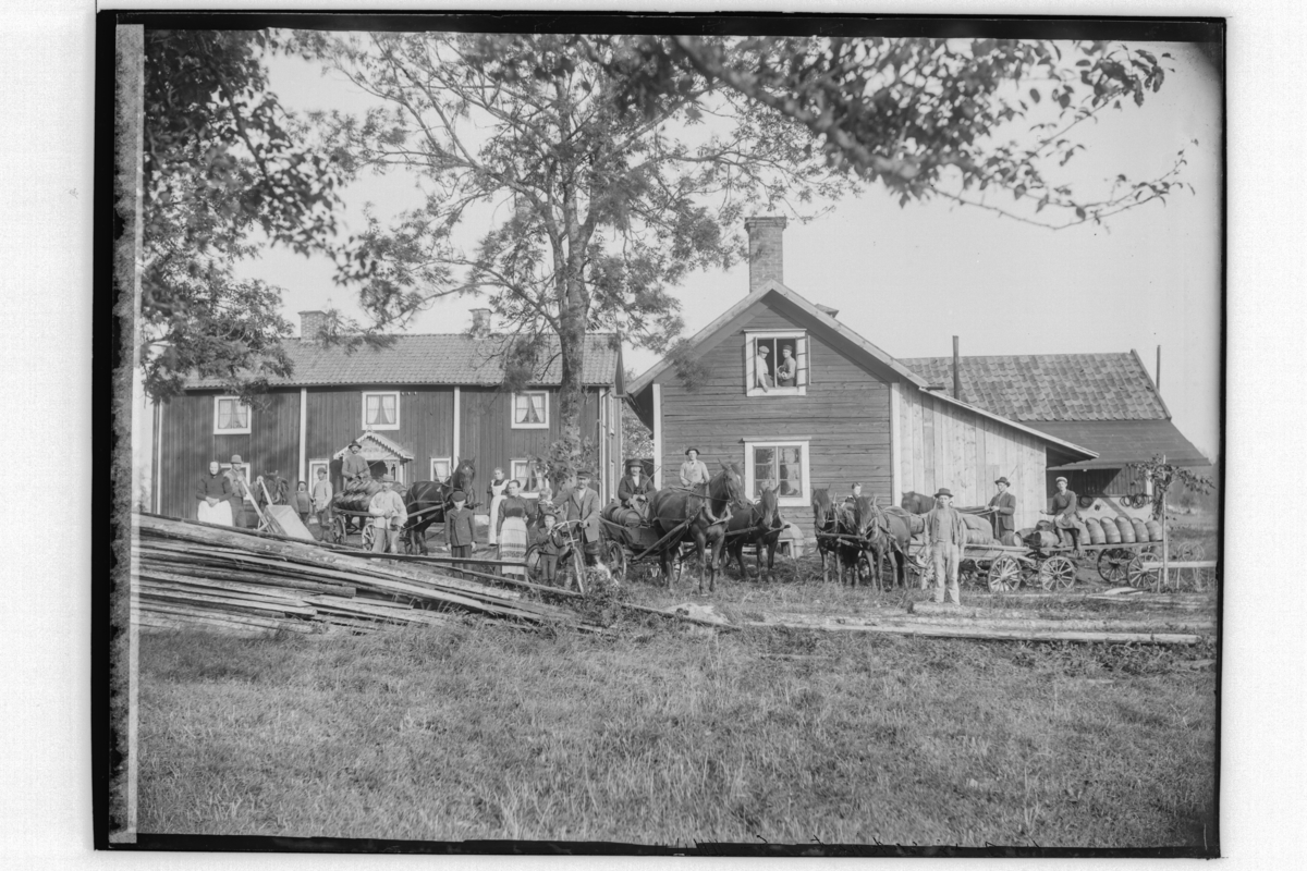 Byggnader, 18 personer. Tvåvånings parstuga, uthus. Sju hästskjutsar med ölkaggar.