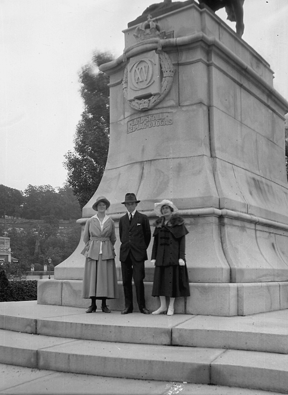 En man och två kvinnor framför Carl XV:s staty i Stockholm.