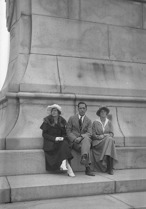 En man och två kvinnor framför Carl XV:s staty i Stockholm.