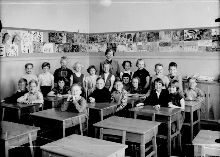 Almby Östra skola, klassrumsinteriör, 21 skolbarn med lärarinna fru Ingeborg Tedner.