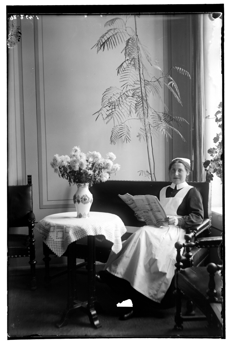 Hålahults sanatorium, interiör, diakonissa sittande i soffa vid bord