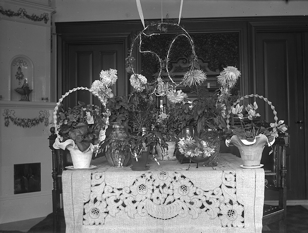 Rumsinteriör, födelsedag, bord med blommor och blomsterkorgar.