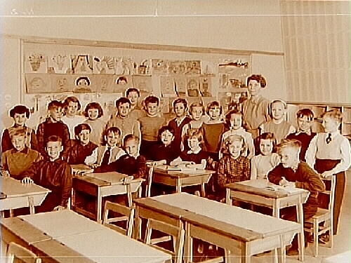 Titel: Vasaskolan, klassrumsinteriör, 24 skolbarn med lärarinna fru Märta Sahlin, klass 2t, sal 6.