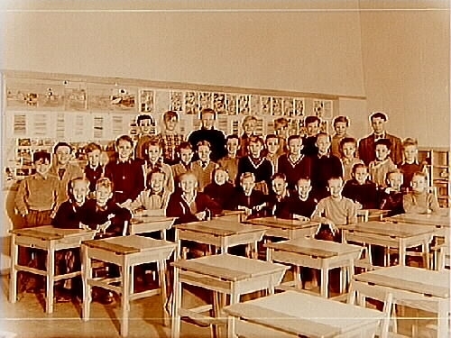 Vasaskolan, klassrumsinteriör, 34 pojkar med lärare Olof Lundin, klass 4F, sal 2.