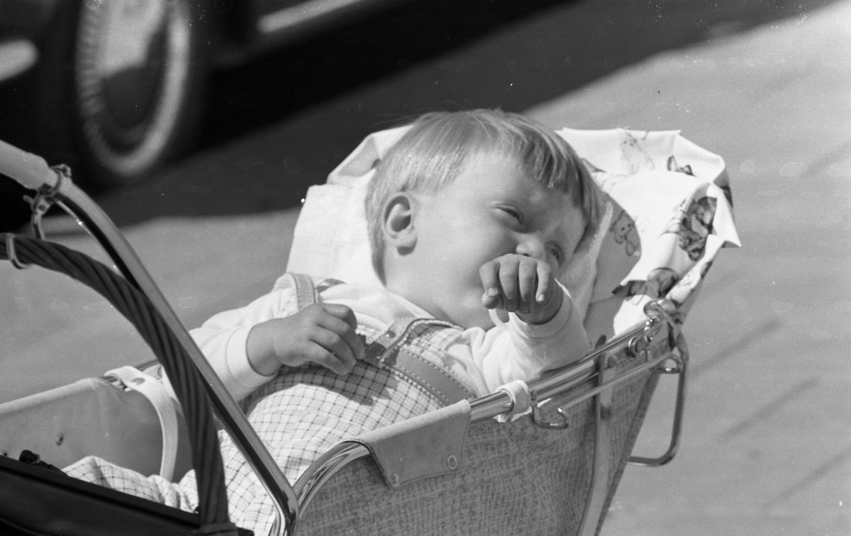 Närbild på en liten pojke i ettårsåldern som ligger i en barnvagn fastspänd med en sele runt kroppen. Han är klädd i en vit långärmad tröja och en rutig hängelbyxdress. I bakgrunden syns hjulet på en bil som passerar.