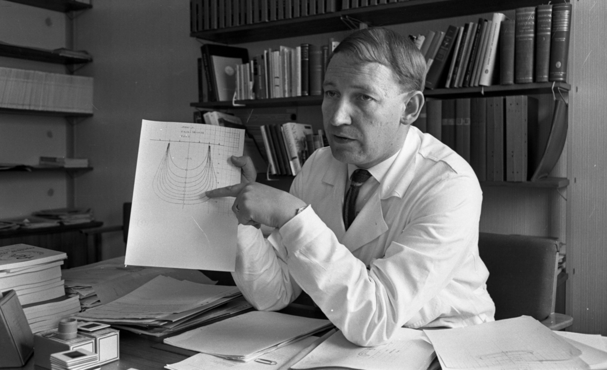 En läkare sitter inne på sitt kontor vid sitt skrivbord. Han är klädd i vit läkarrock, vit skjorta och mörk slips. Bokhyllor och böcker syns i bakgrunden. Han demonstrerar ett diagram på ett papper.
