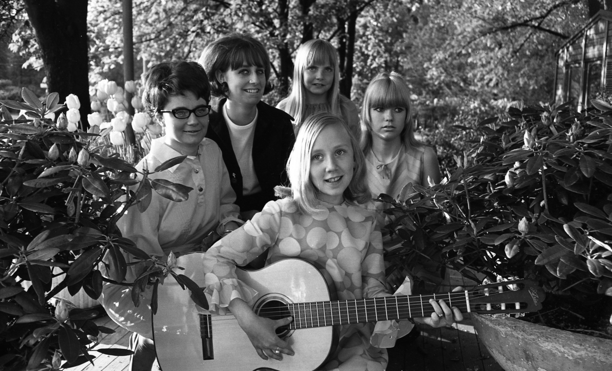 Tre flickor och två vuxna kvinnor. En av flickorna sitter framför gruppen med en gitarr i sina händer. Hon är klädd i en långärmad klänning med volanger och bubbelmönster. En av de vuxna kvinnorna bär glasögon.