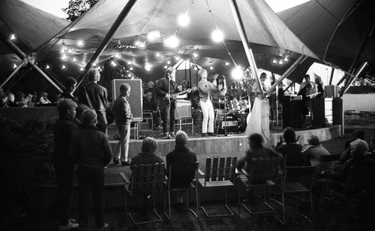Ungdomar uppträder på en utomhusscen på Gustavsvik och sjunger och spelar gitarr, maracas och piano. En tonårspublik tittar på.