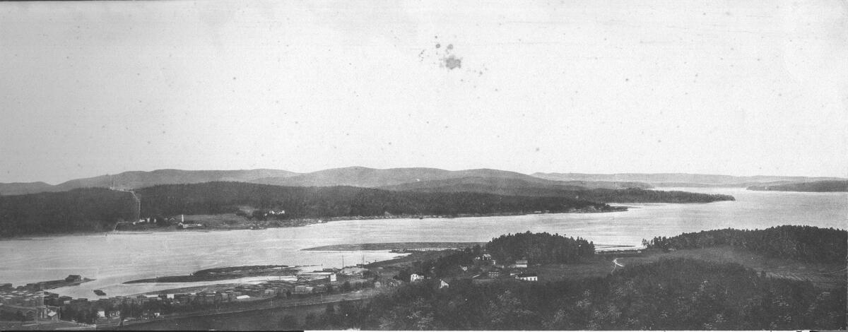 Vy över Nyland och Ångermanälven, med "Lilla Norge". Vykort. Montage.