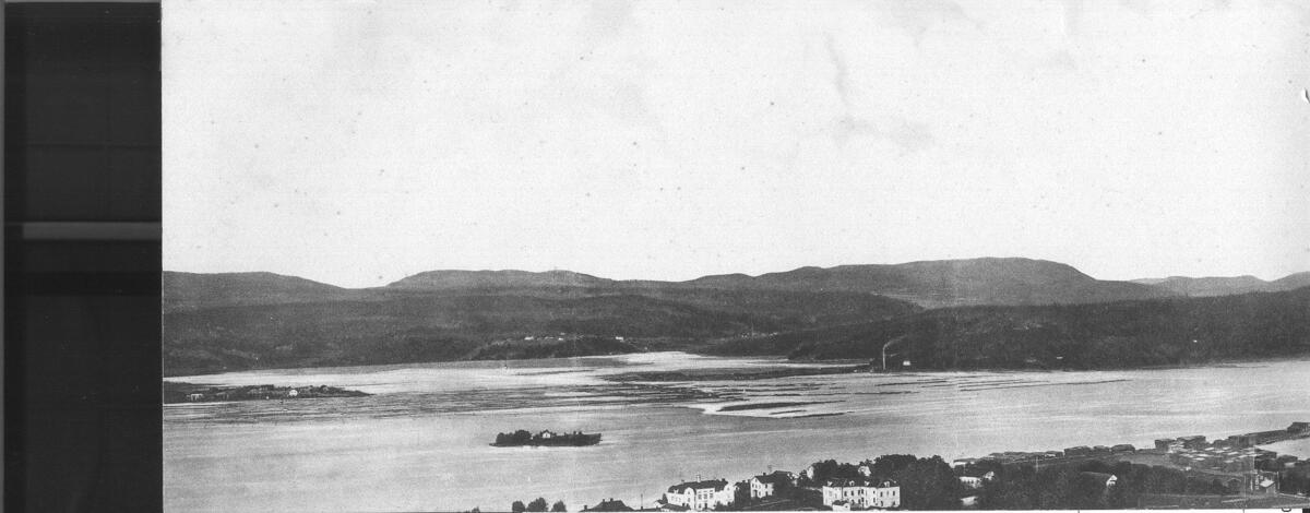 Vy över Nyland och Ångermanälven, med "Lilla Norge". Vykort. Montage.