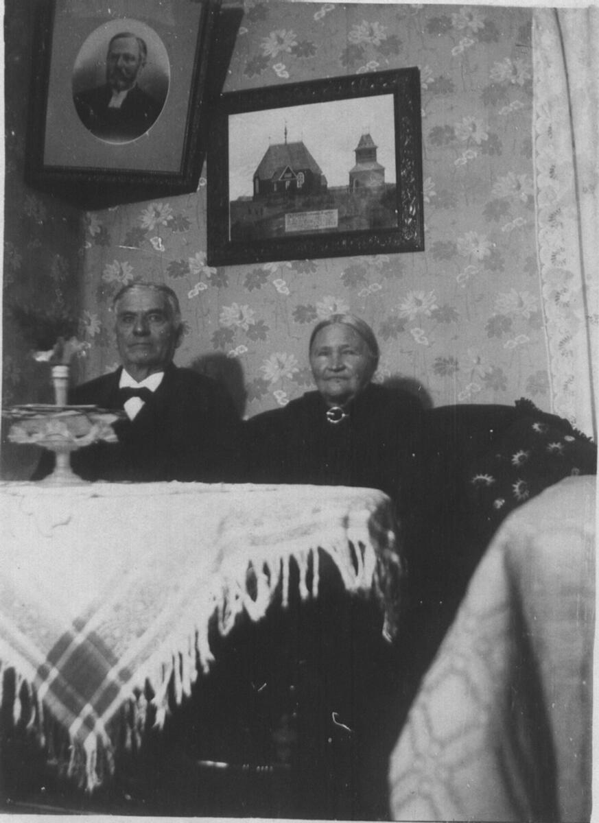 Magnus och Kajsa Jonsson (född Danielsson). På tavlan syns Mo kyrka, Junsele socken, som övergavs när den nya kyrkan i Junsele byggdes. Lägg märke till hängningen av tavlan i hörnet!