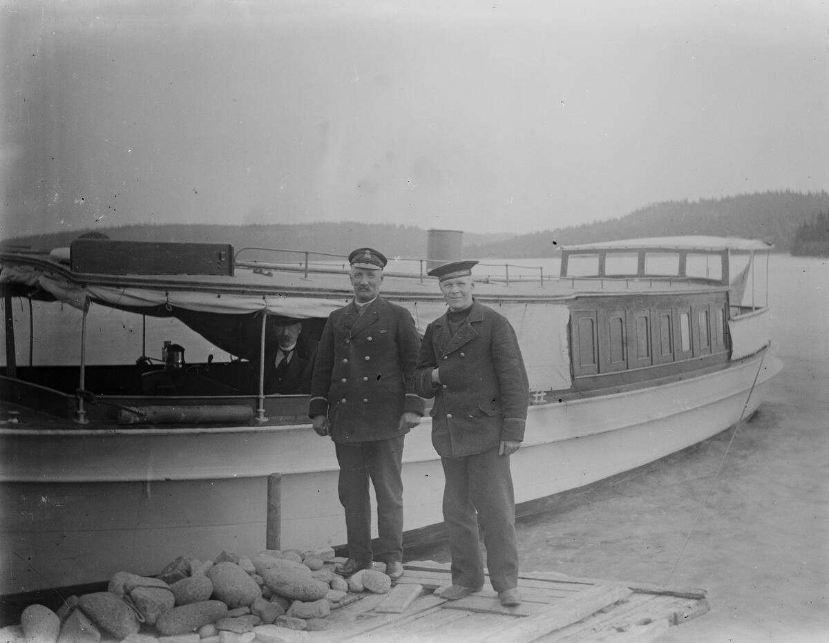 Titel: Detta bör vara den specialbyggda båten för att kunna lägga till i Dalomsviken. Enligt Sonja Sahlström, skriver "En flatbottnad båt, rätt stor, styrhytten, som far stod i med maskin och maskinist bakom ryggen, en dundrande dieselmotor, en stor salong, som också var pentry och aktersalongen, med sin röda sammetinredning och akterdäck, med korgmöbel, samt den tretungade flaggan doppande i vattnet. Båten användes för inspektionsresor utefter kusten och på öar. Det borde således vara Sahlström ombord (fast den manen ser inte ut att vara Sahlström) maskinisten den med ett streck på ärmen medan den tredje är kanske en anställd på ettårskontrakt.