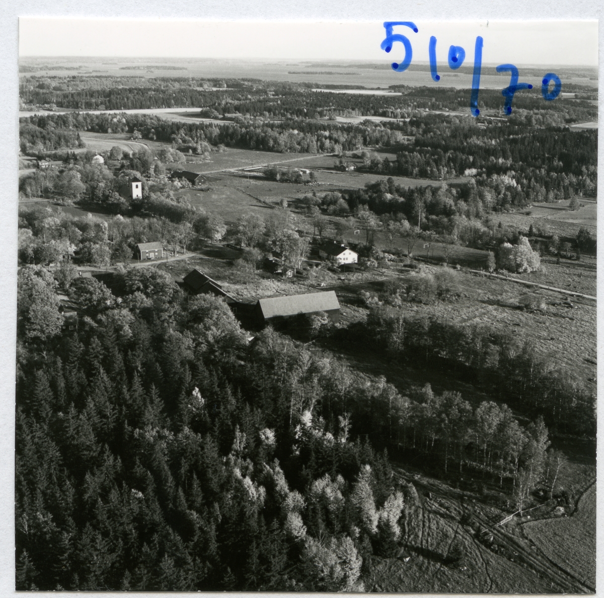 Flygfoto över Barkarö-området, med kyrkan, 1970.
