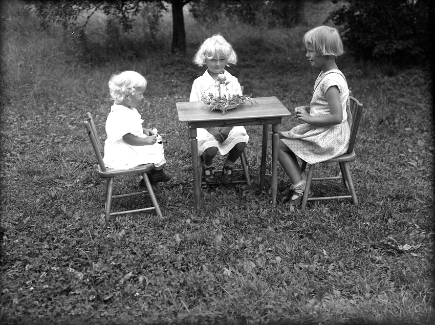 Tre småflickor sitter på barnstolar vid bord med leksak på i trådgård. Västerås.