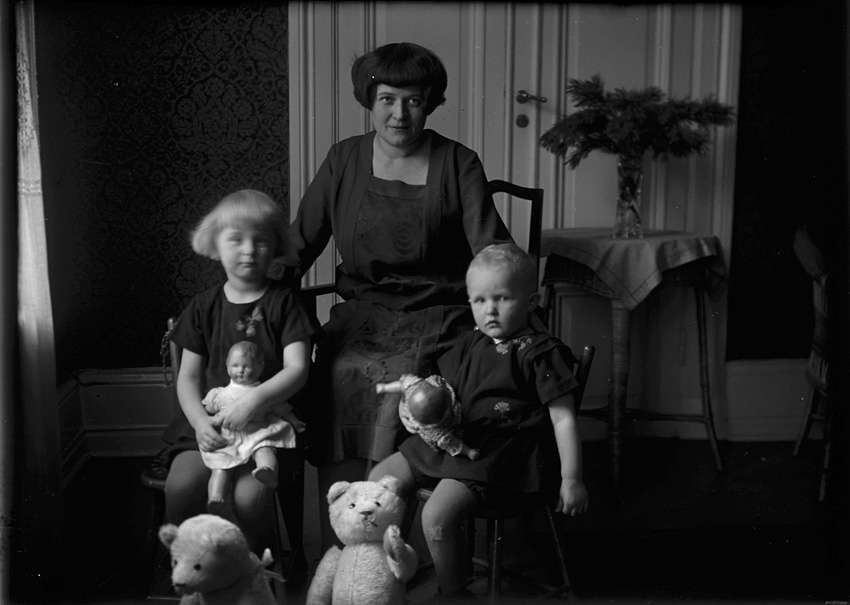 Kvinna, sittande med två flickor med deras dockor och nallar.