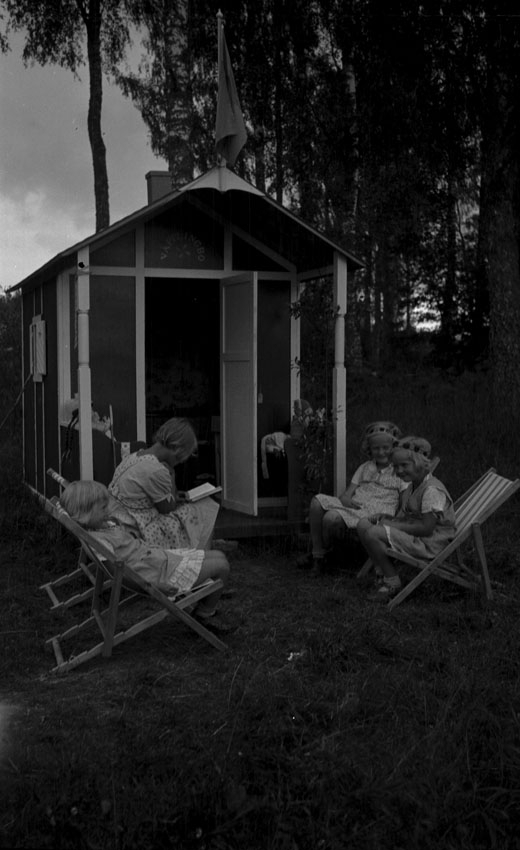 Lekstuga med fyra barn i små vilstolar framför. Västerås.
