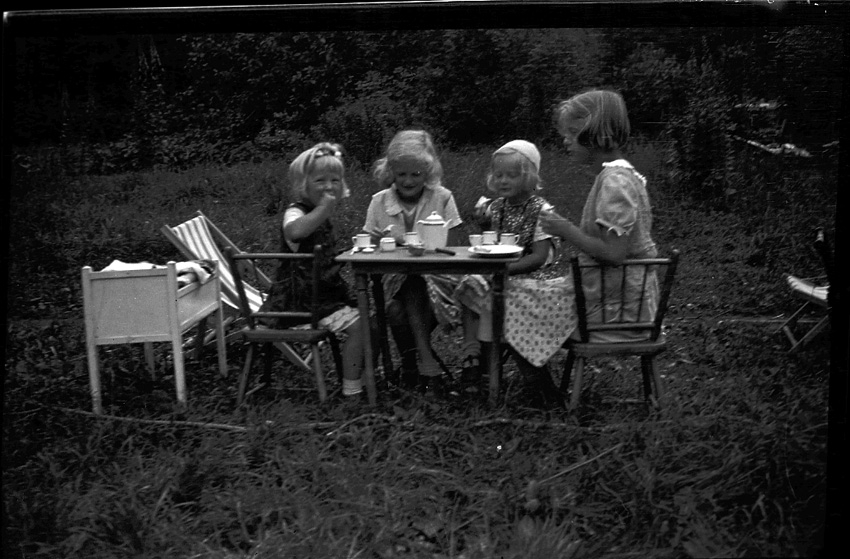 Fyra småflickor dricker "kaffe" vid barnmöbler i gröngräset.