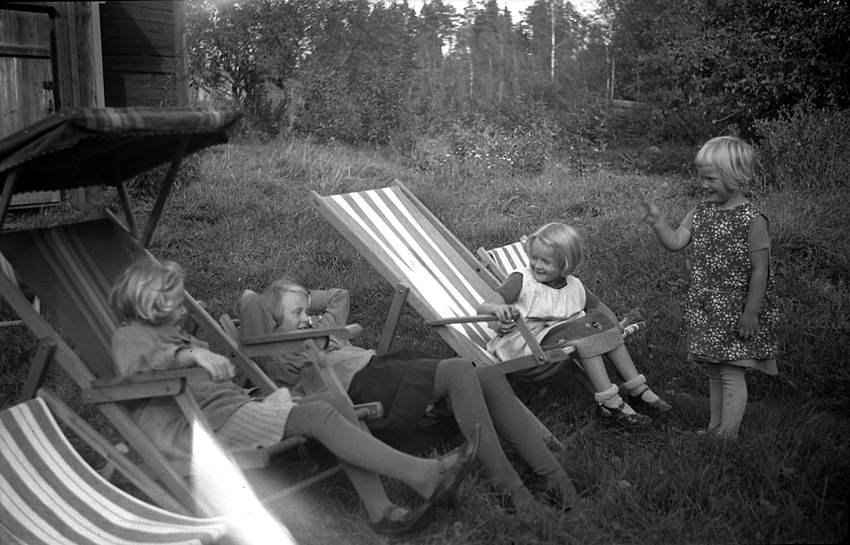 Fyra barn leker i gröngräset utanför hus. Västerås.