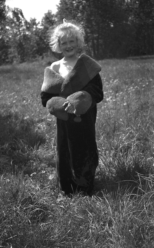 Flicka, klädd i för stor damkappa, i trädgård. Västerås.