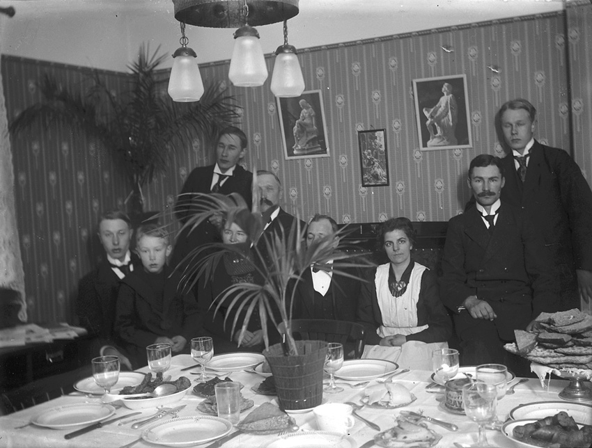 Gruppfoto vid middagsbord i salen. Västerås.