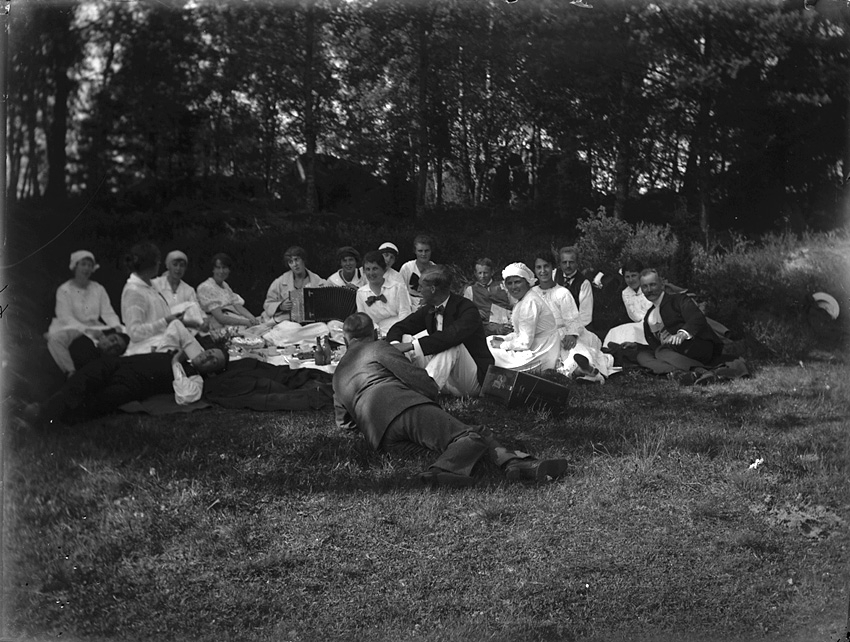 Stort sällskap som har picknick i skogsbacke. Ryd, Småland.