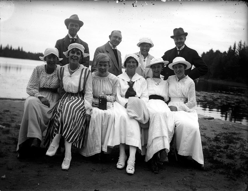 Grupporträtt av kvinnor och män vid en sjöstrand. Ryd, Småland.