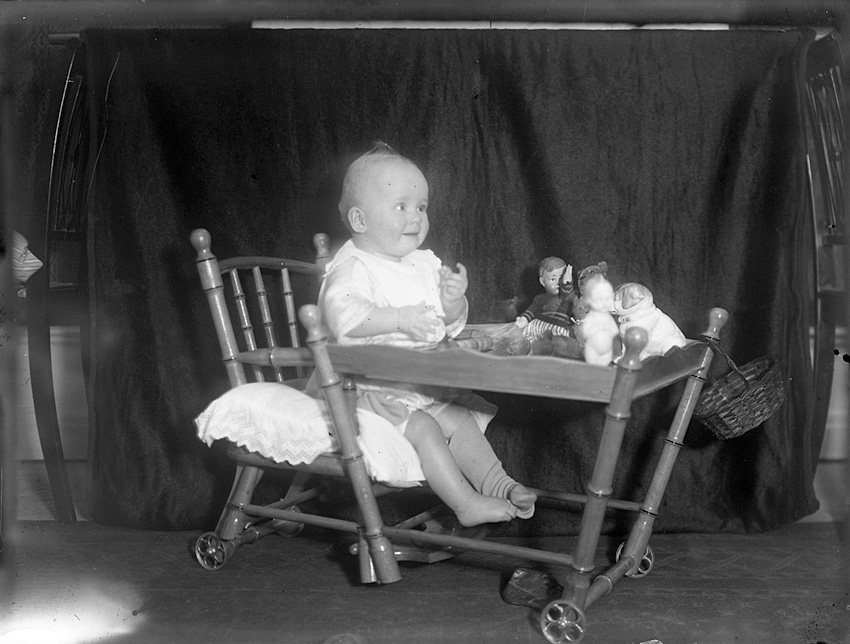 Litet barn sittande i stol och bord förenade genom gångjärn. Västerås.