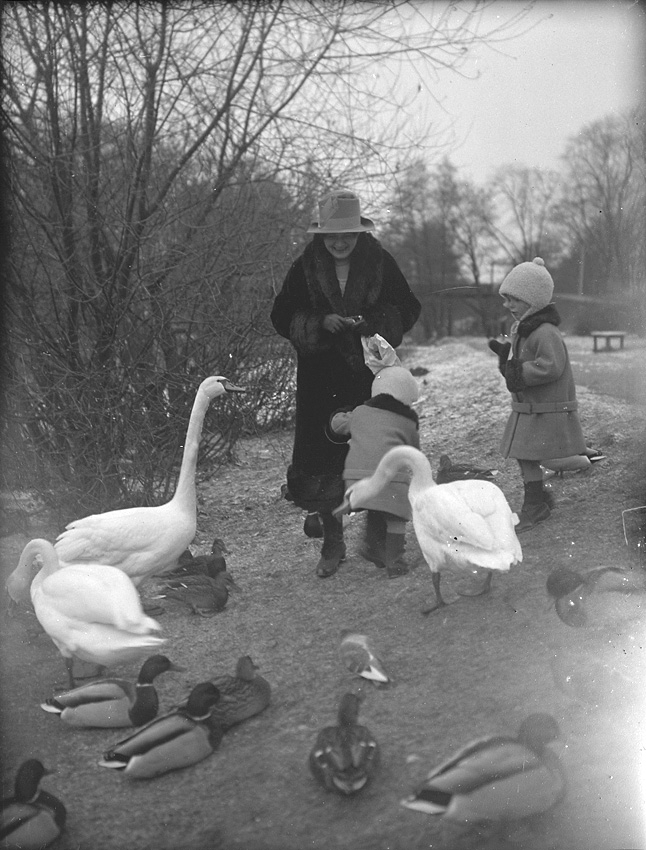 Kvinna och två barn matar änder och svanar i en park.