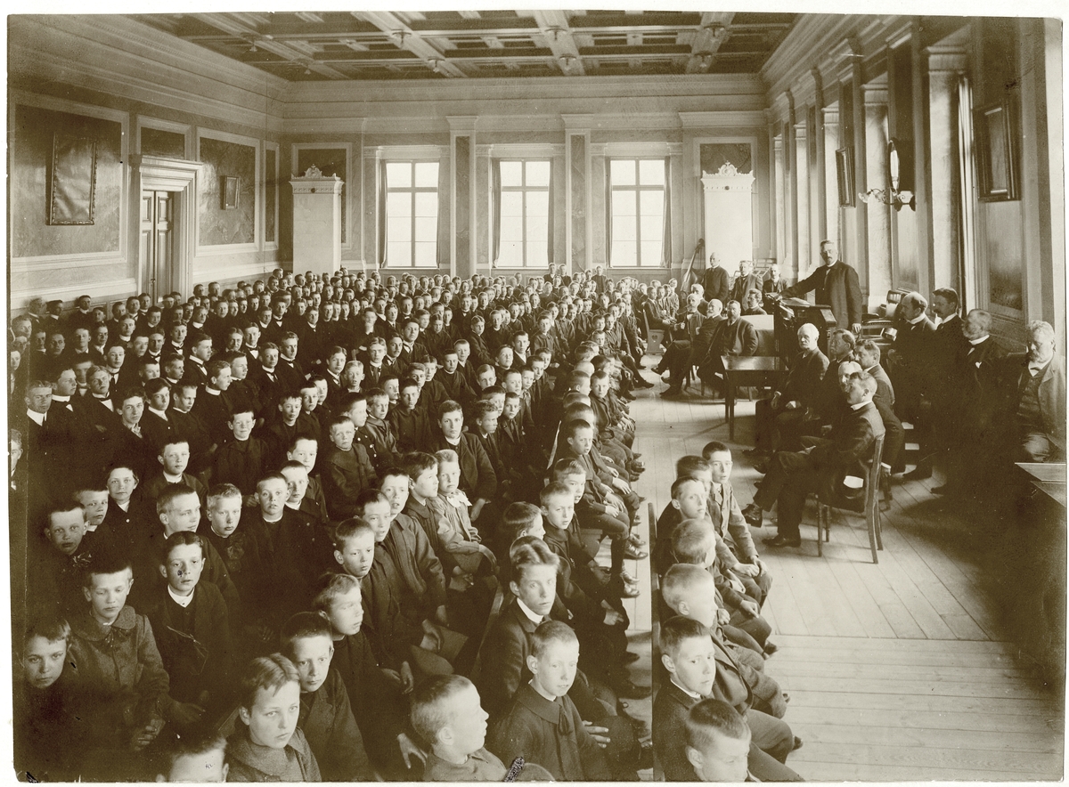 Rudbeckianska skolan. (Västerås allmänna läroverk). Samling i aulan.