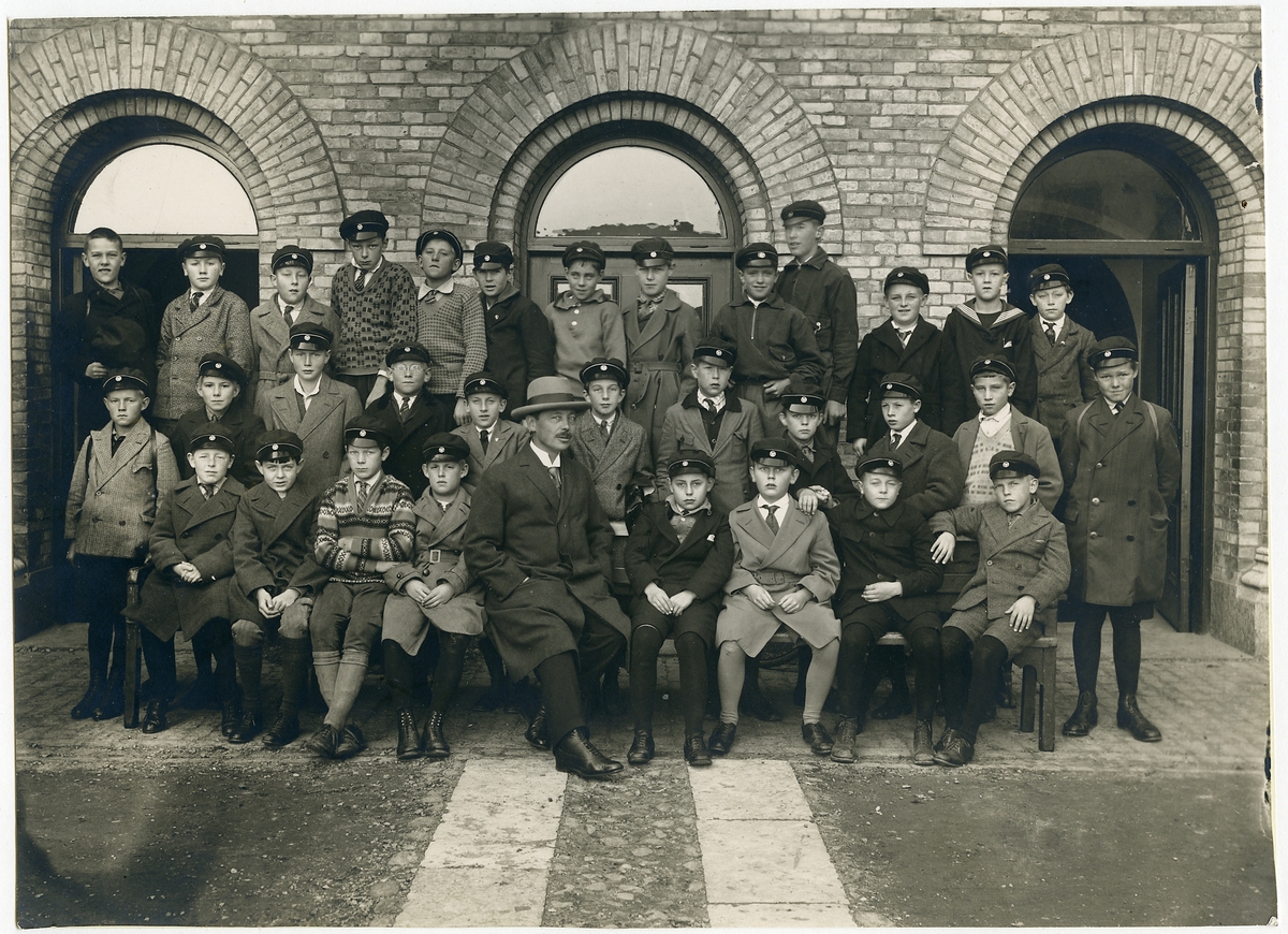 Rudbeckianska skolan - Högre Allmänna Läroverket. Gruppbild med lektor Erik Wahlberg och skolklass.