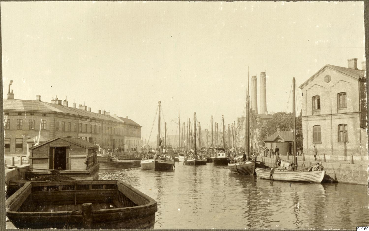 Rosenlundskanalen med fiskbåtar, blick norrut mot Göta Älv. Till vänster Pustervik och till höger Fisktorget med Ångköket.