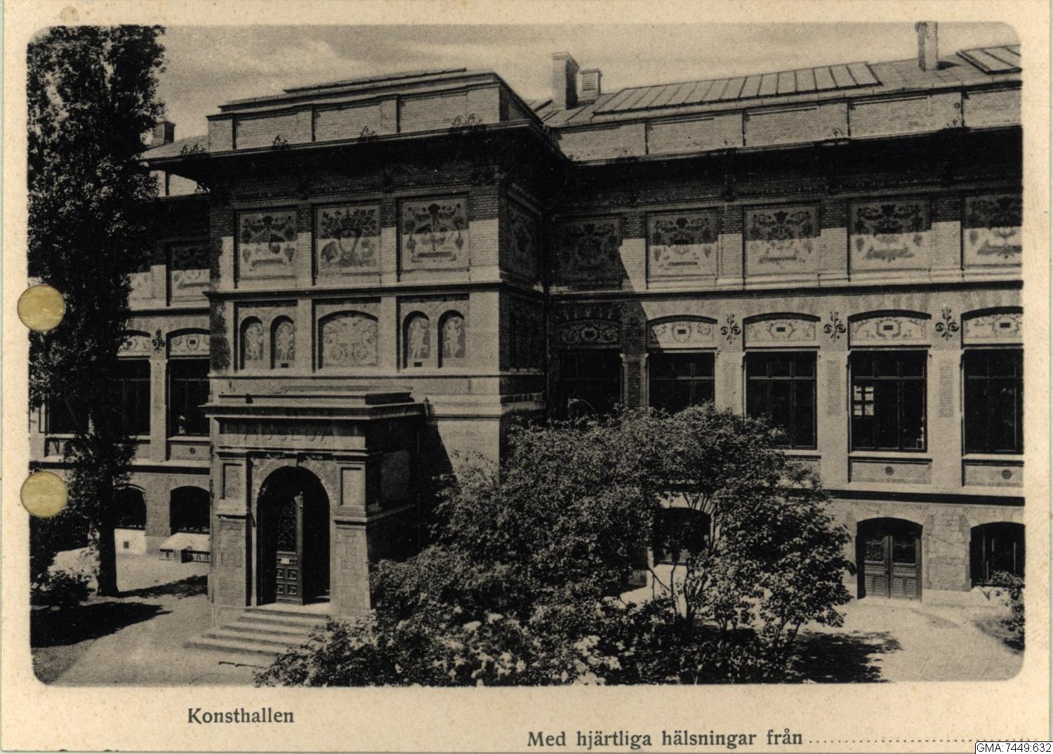 Göteborgs Museum, Wilsonska flygeln, fasaden mot gården. Muralmålningarna under taket visar museets verksamhetsområden.