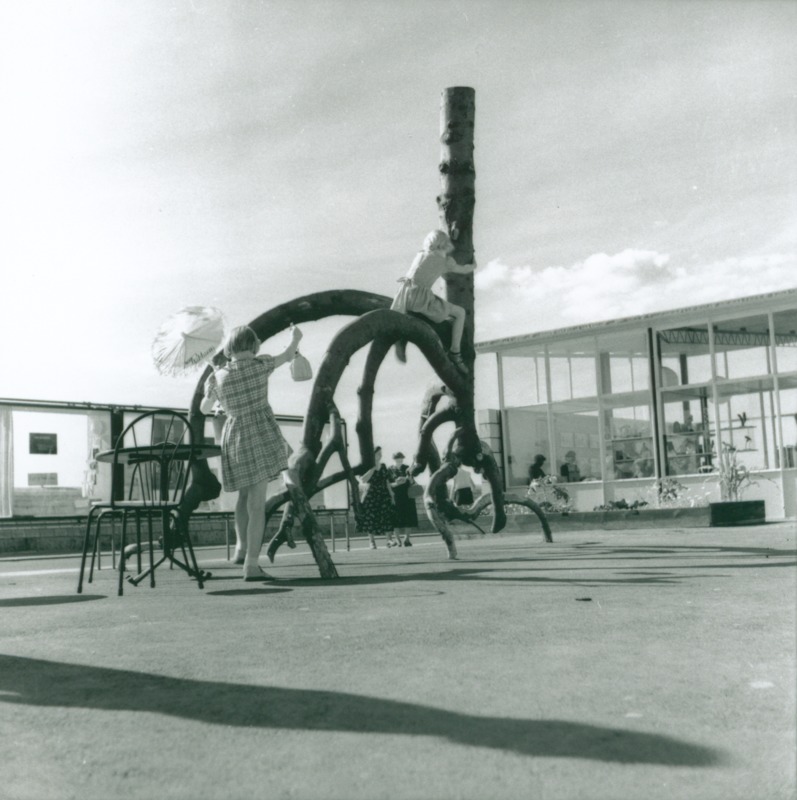 Bilden föreställer i bakgrunden paviljonger och en vägg med glas. I förgrunden en öppen yta med skulpturer. Dels iform av trädstam med långa rötter samt en pinnstol och ett bord. Två flickor klättrar på skulpturen