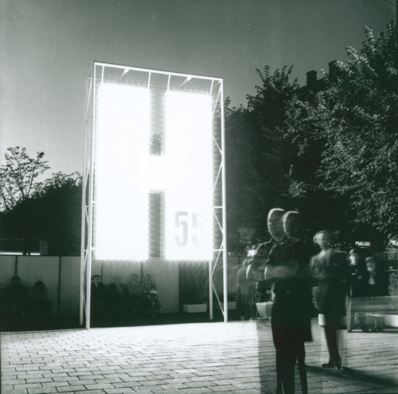 Bilden föreställer en reklamskylt för H55 på ett torg på kvällen. Skylten utgörs av ett stort genombelyst H med siffrorna 55 nere till höger. På torget står det människor.