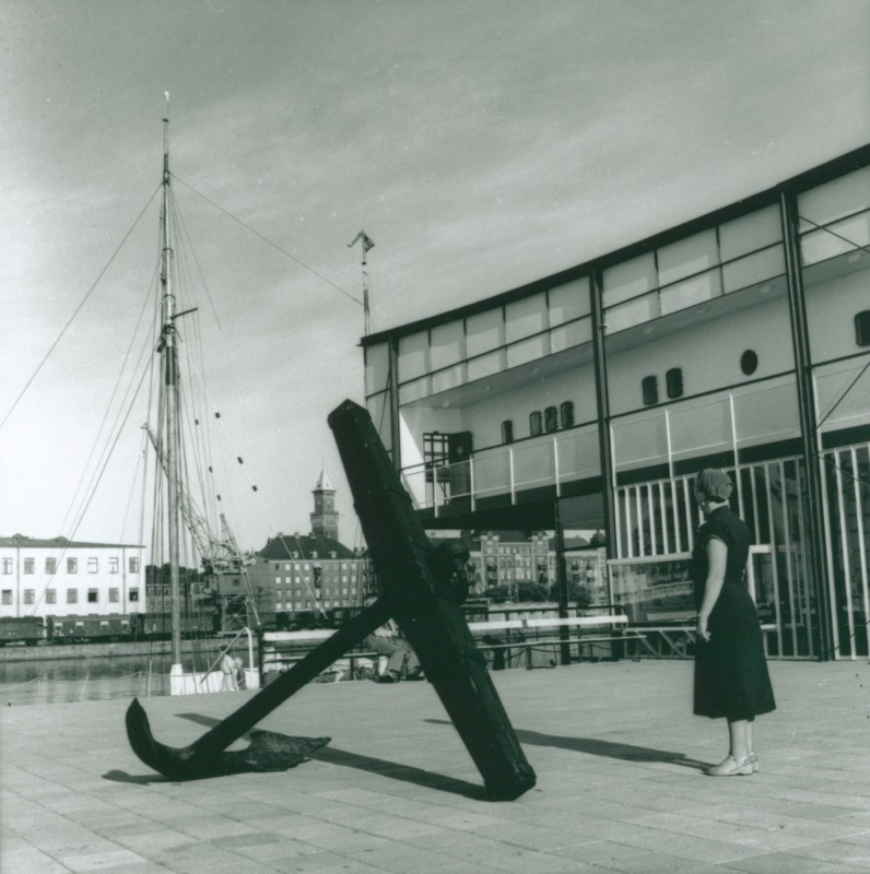 Bilden föreställer ett torg med ett stort ankare samt en kvinna. I bakgrunden del av en paviljong samt hamnen och bebyggelse.